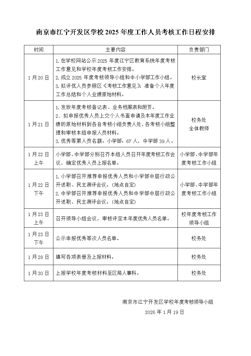 南京市江宁开发区学校2025年度工作人员考核工作日程安排