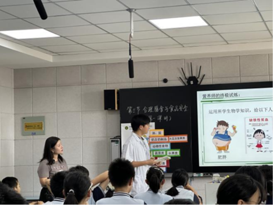 2025年9月23日下午,南京市江宁开发区学校石媛媛老师开设了苏教版新教材八年级上册《合理膳食与食品安全》一课。石老师以“体重管理年”新闻视频为切入点,引导学生关注日常饮食健康,逐步解码食品营养成分表,并通过“建构平衡膳食宝塔”活动,让学生以食物盲盒为材料动手参与,成为课堂的主体。在此基础上,学生调研自身日常膳食问题,分析学校一周食谱,并自主设计一日食谱,验证其合理性与科学性。课程最后布置了实践性作业——定制家庭营养食谱或制作一份营养餐,将课堂所学延伸至生活实际,增强了知识的应用性。